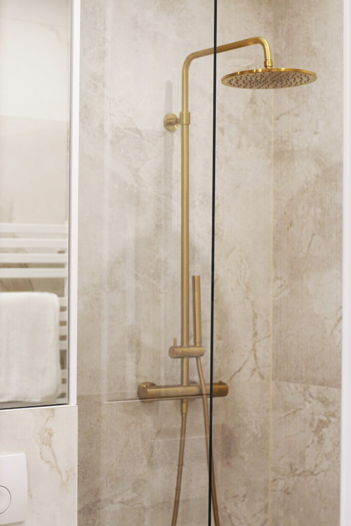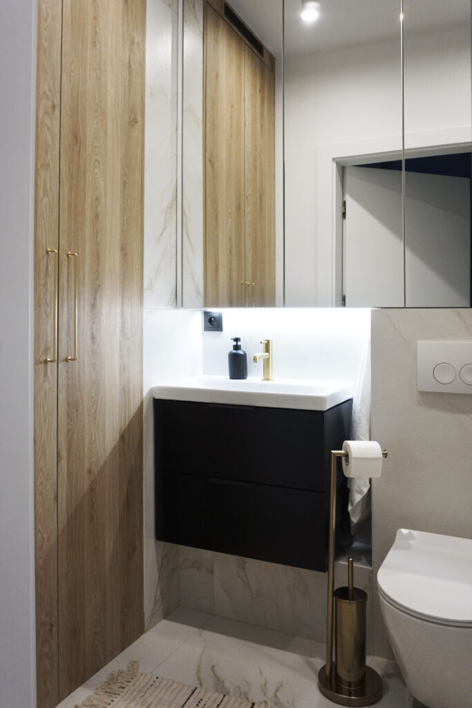 Łazienka, utrzymana w ciepłych beżach, z płytkami imitującymi lastryko, wprowadza delikatną strukturę i wizualne urozmaicenie, pozostając spójną z resztą mieszkania.
