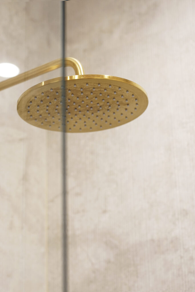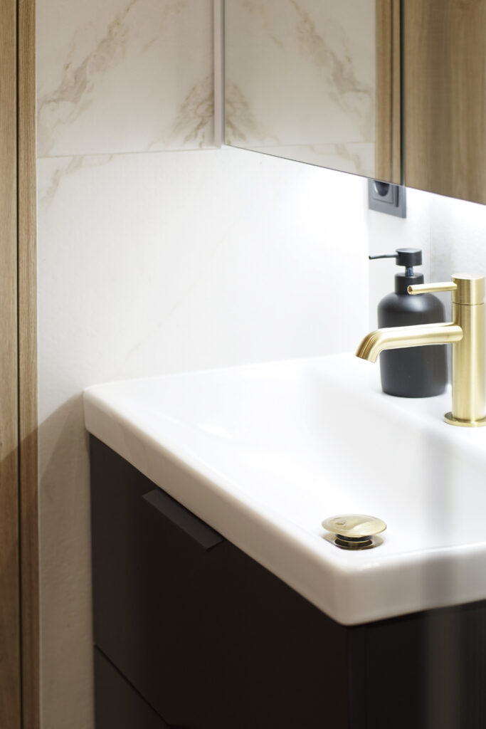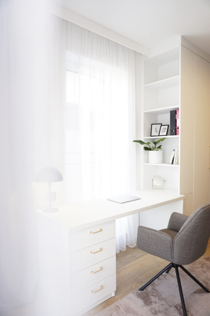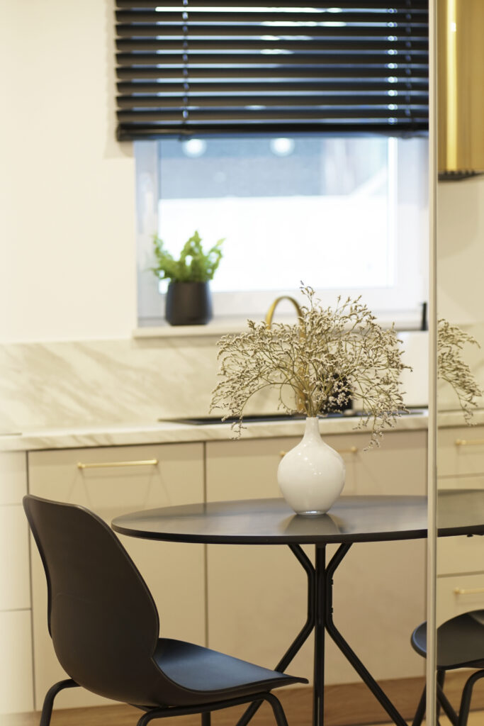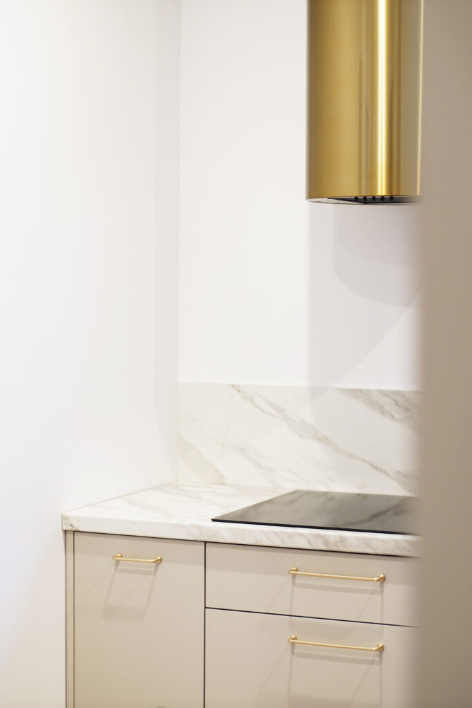 Jasne mieszkanie z ciepłym beżem, drewnem i złotym akcentem
