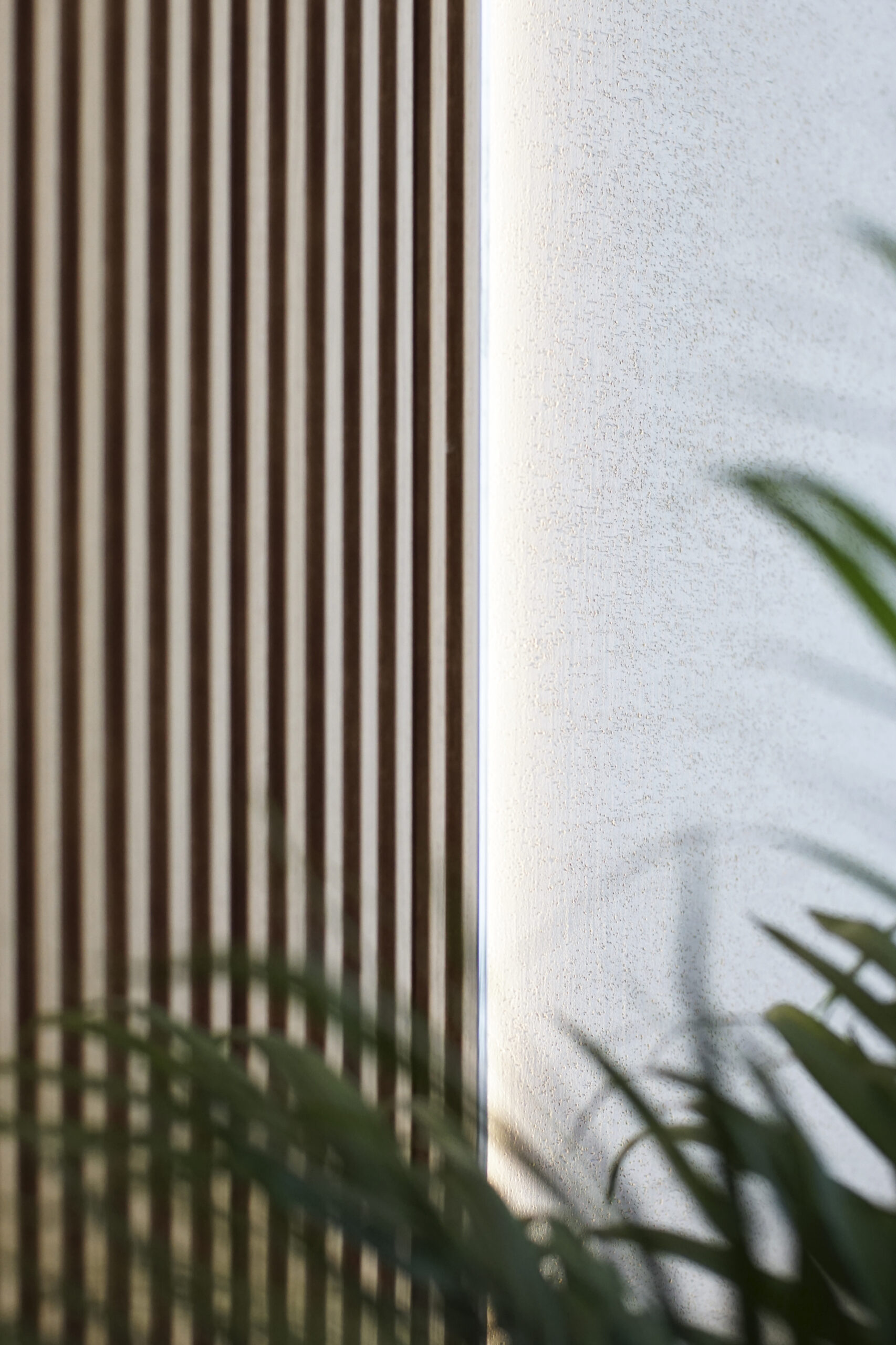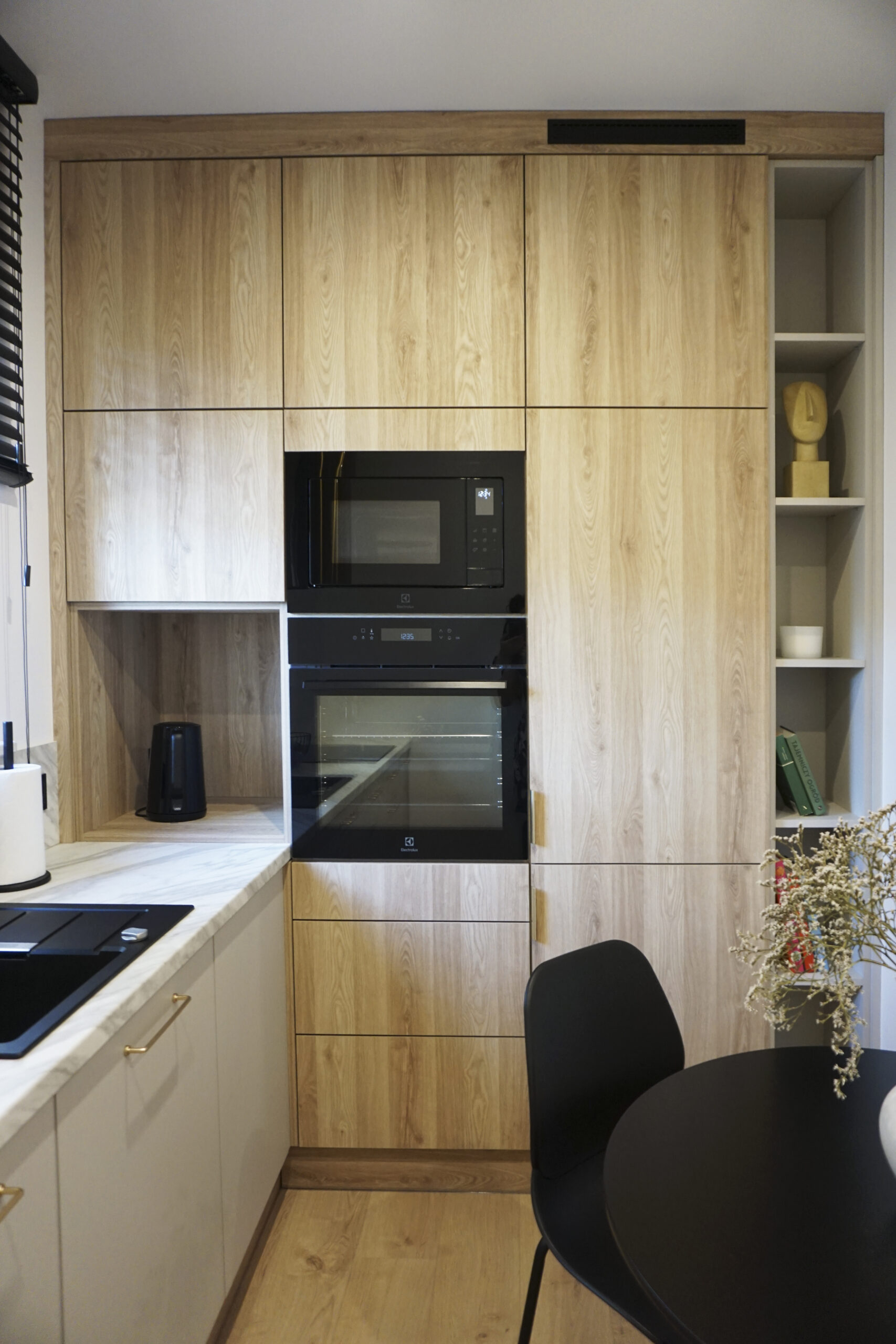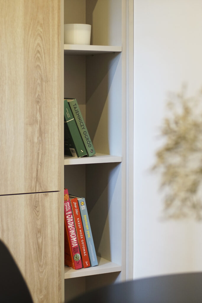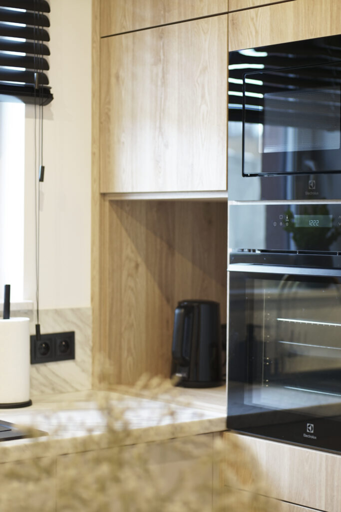 Otwarta kuchnia połączona z salonem tworzy jedną, spójną przestrzeń do codziennego życia. Zabudowa kuchenna w ciemnym fornirze z dekoracyjnymi obramowaniami frontów nadaje całości elegancji i lekko klasycznego rytmu, który kontrastuje z prostotą białych płaszczyzn. Blat z konglomeratu dodaje wnętrzu jasności i subtelnej nowoczesności.