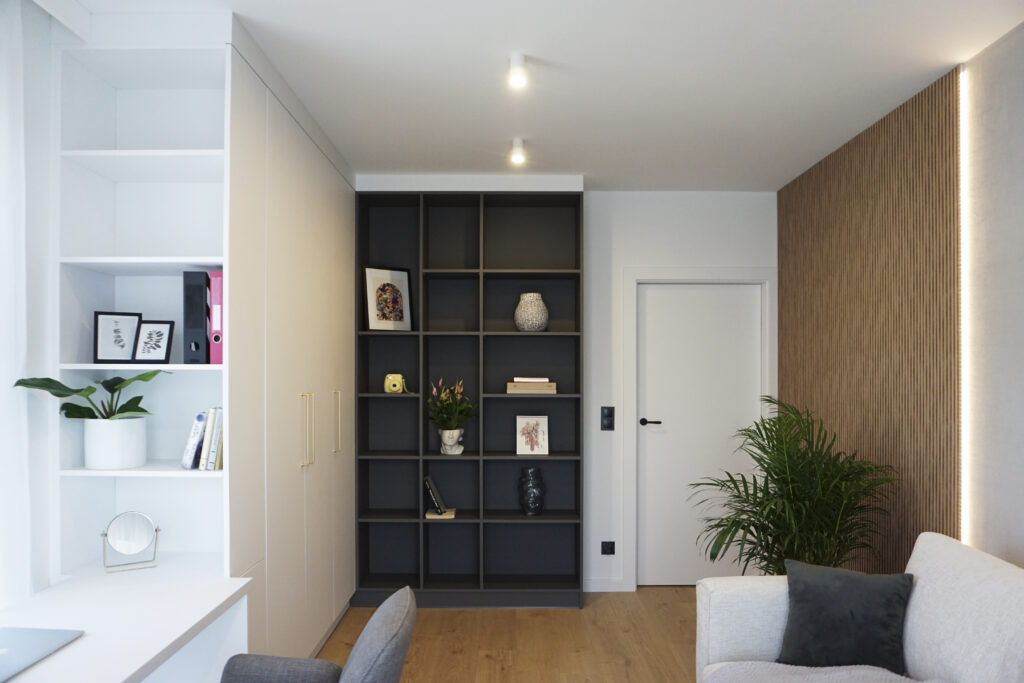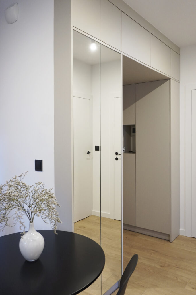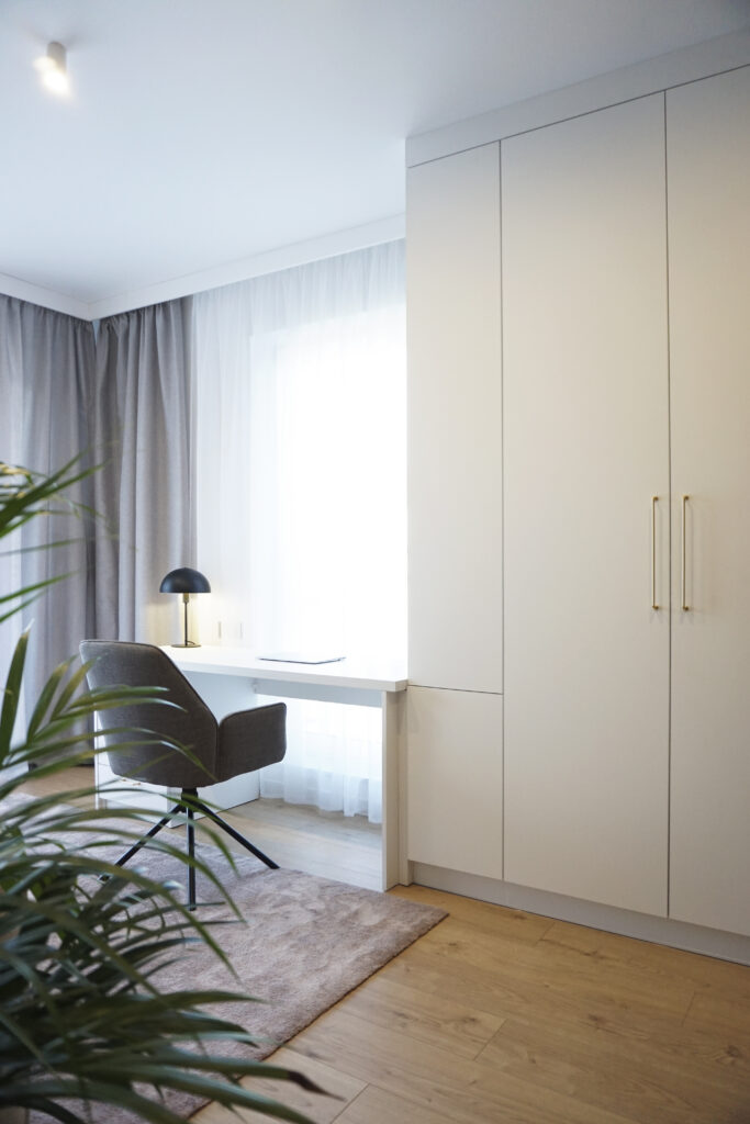 To mieszkanie zostało zaprojektowane w duchu minimalizmu i klarownej kompozycji, w której białe ściany stanowią spokojne tło dla wyrazistych detali. Paletę kolorystyczną budują tu odcienie granatu oraz pomarańczowo-musztardowe akcenty, które wprowadzają energię i charakter, nie zaburzając harmonii wnętrza.